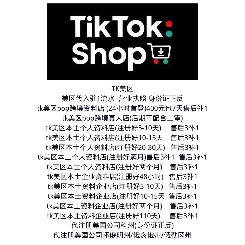 TK美区全套跨境服务,涵盖代入驻+流水、Pop跨境资料店(24小时首登1400元起/售后补1)、Pop跨境真人店(后期可配合二审)、本土个人/企业资料店(注册5-110天,售后3补1)。支持美国公司注册(含 EIN/身份证明),源头现货,快速交付。